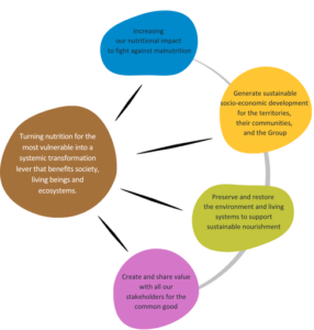 These four pillars all contribute to achieving the central objective. Interconnected, they form a living system that continuously learns, evolves, and strengthens itself. Each action enhances our collective ability to create social, societal, and economic opportunities, to preserve and restore resources, and ultimately to build resilient and beneficial ecosystems serving the nutrition of the most vulnerable populations wherever we operate.